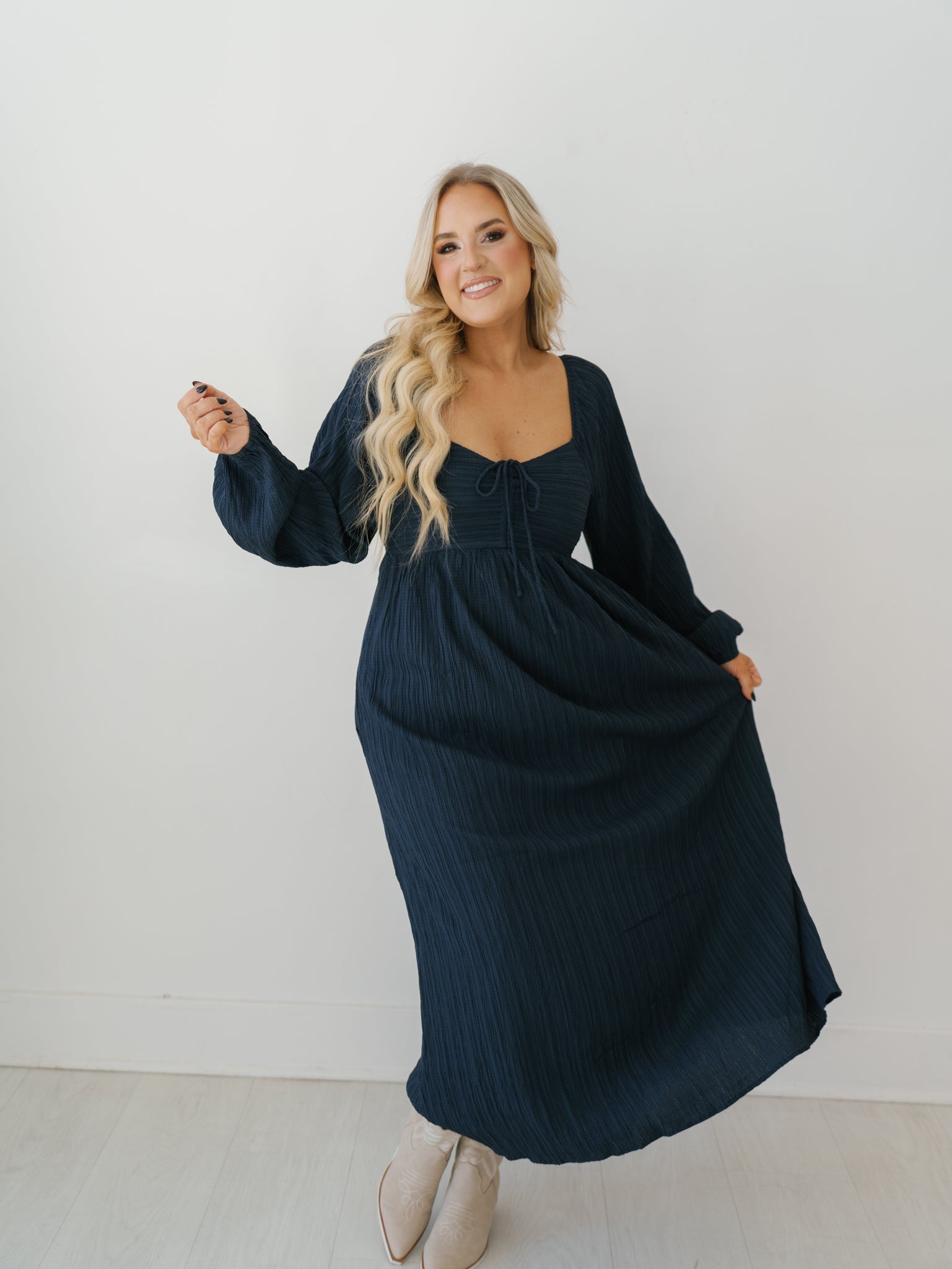 Prepare to turn heads in the "Cameron Dress!" This navy midi dress is a feminine and elegant staple for any wardrobe! It boasts a textured fabric throughout along with cinching in the bust. The smocked back and relaxed skirt make this dress not only comfortable, but also flattering!