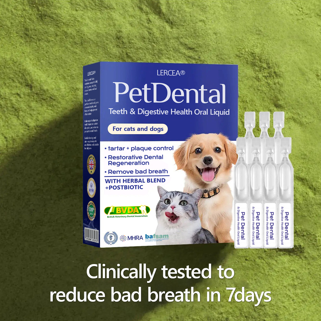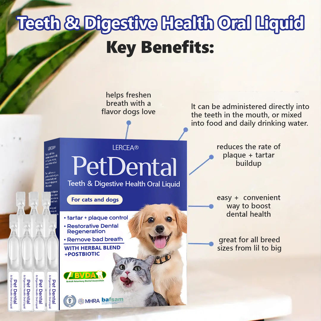 LERCEAยฎ Oral Liquid for Pet Dental and Digestive Health eliminates 99.99% of bacteria, combats bad breath, removes plaque and tartar, treats gingivitis, and supports your pet's dental health. This oral liquid contains natural ingredients that gently but effectively clean your pet's teeth and promote gum health.